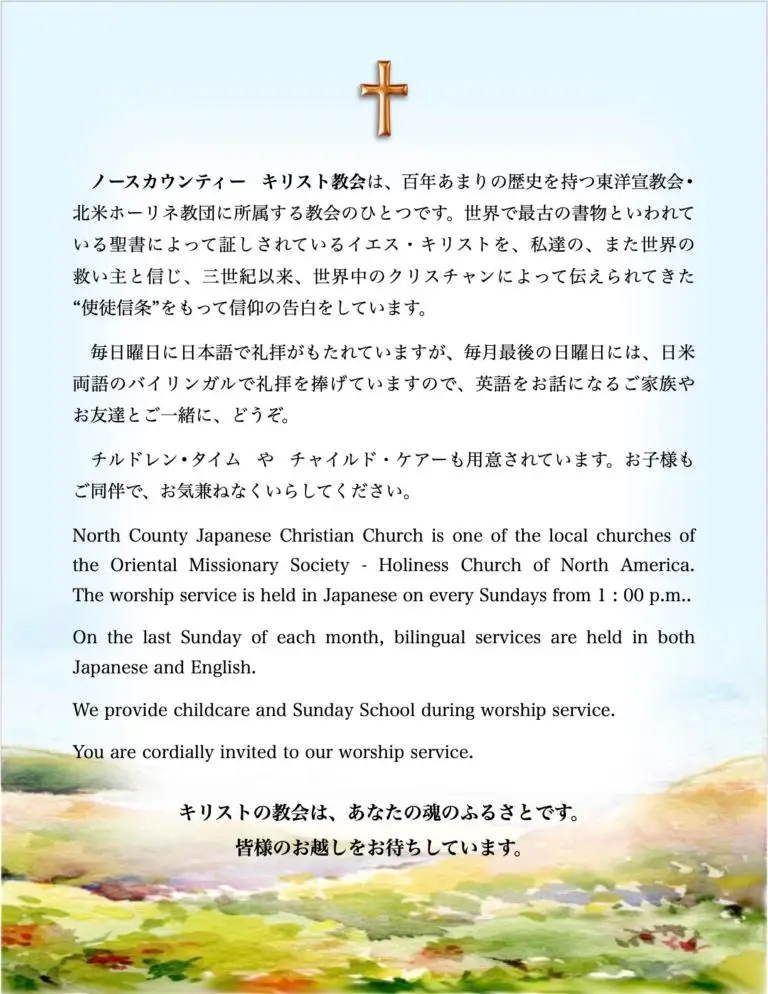 礼拝時間 : 日曜日 Sunday 1:00 PM